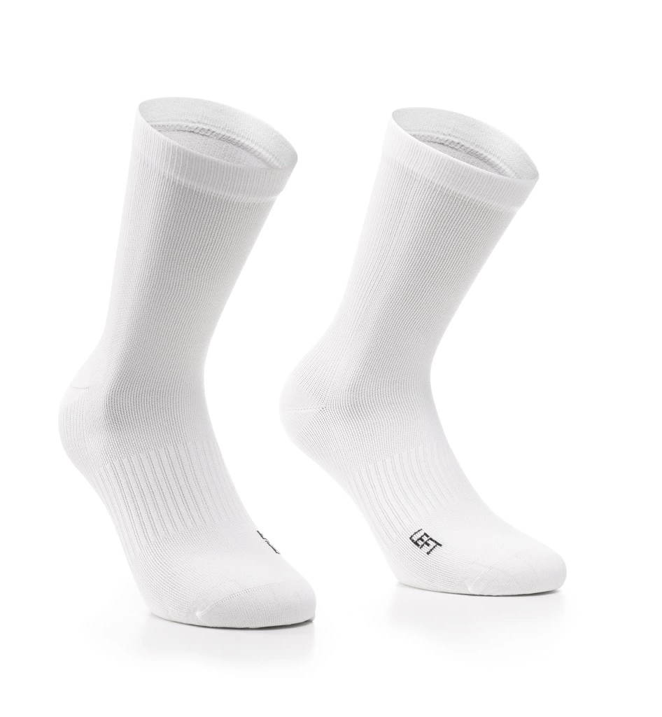 Klassiske og stilrene Assos Essence Cykelstrømper i hvid med højt skaft.